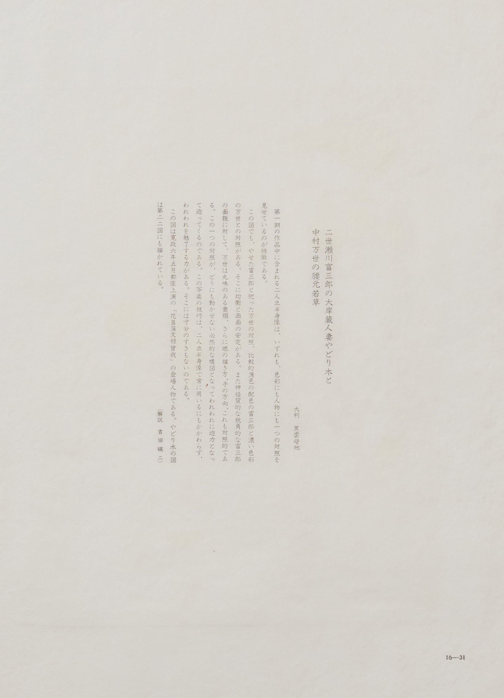 Among the works of the first period, the paired half-length portraits all exhibit a characteristic contrast in both color and character. In this picture as well, there is a contrast between the slender Tomisaburō and the plump Manse, as well as between Tomisaburō's relatively light coloring and Manse's rich palette. This balance brings stability to the composition.