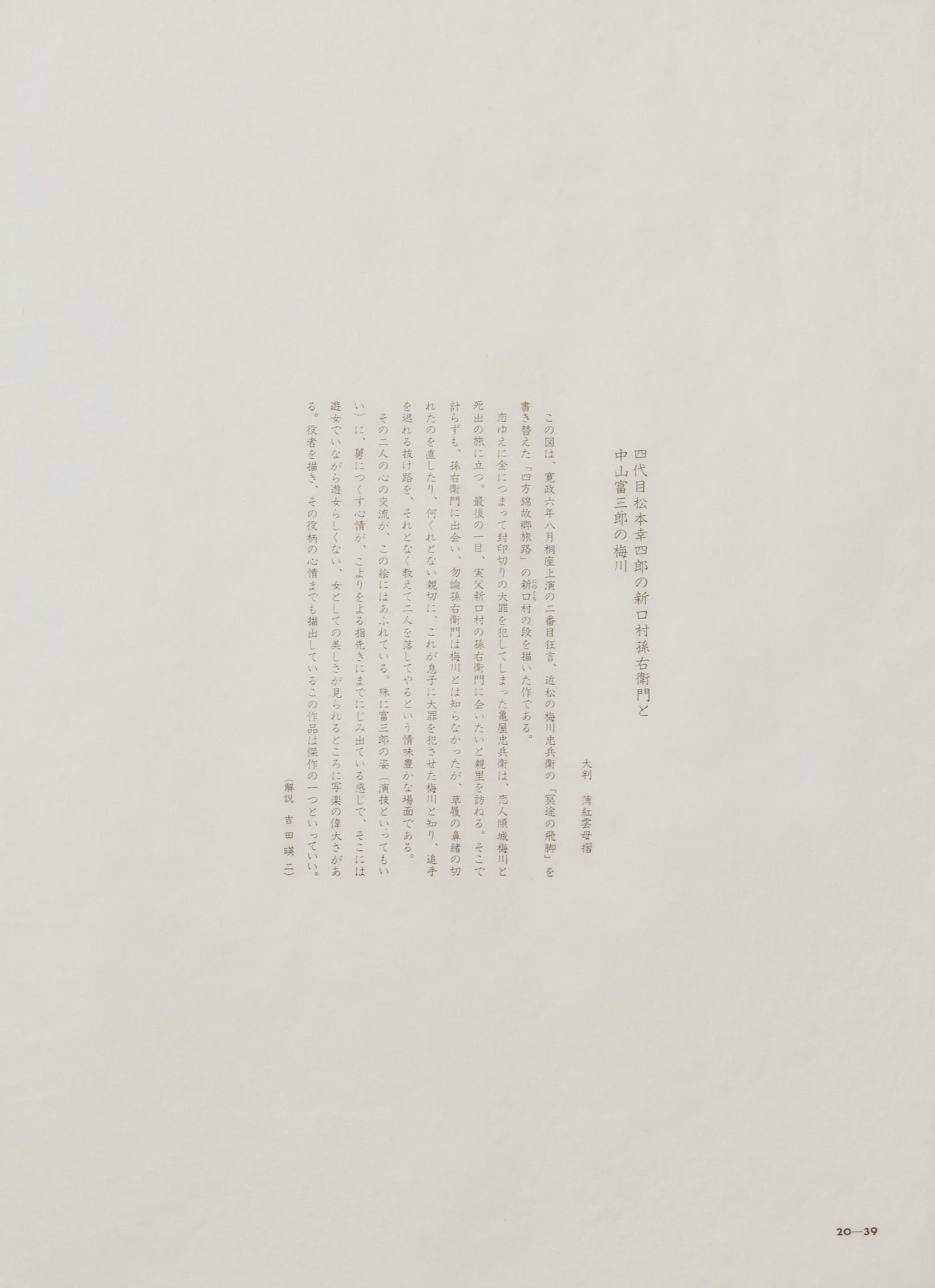 "Kameya Chūbei, driven to commit a serious crime due to love and financial difficulties, embarks on a journey with his lover, Keisei Umekawa. Before their final parting, Chūbei expresses his desire to visit his hometown and see his adoptive father, Ninokuchimura Magoemon. By chance, they meet Magoemon, who, of course, does not recognize Umekawa. Magoemon kindly fixes her sandal strap and offers assistance without knowing that Umekawa is the woman who led his son into committing the crime. He subtly guides them to escape the pursuers, displaying a scene filled with poignant emotions. The emotional connection between the two characters is overflowing in this picture. "In particular, Tomisaburō's portrayal (which can be called acting) of the emotions toward his son-in-law is so deeply expressed, even down to the fingertips, that it showcases the greatness of Sharaku. His portrayal captures both the essence of the character and the inner beauty of the woman, despite her being a courtesan but displaying an uncharacteristic gracefulness, highlighting Sharaku's greatness. This artwork, which depicts both the actors and the emotions of their roles, can be considered one of his masterpieces.