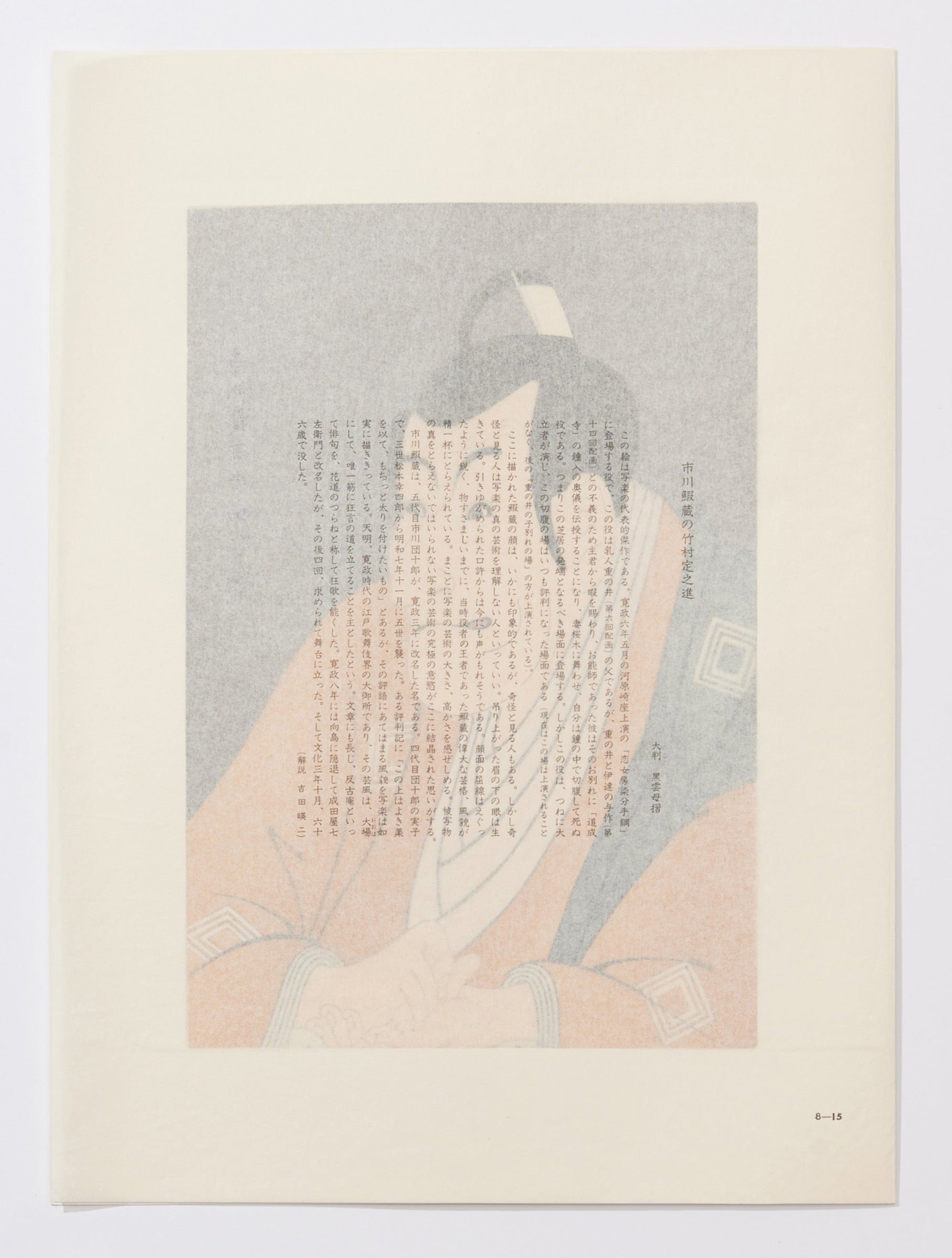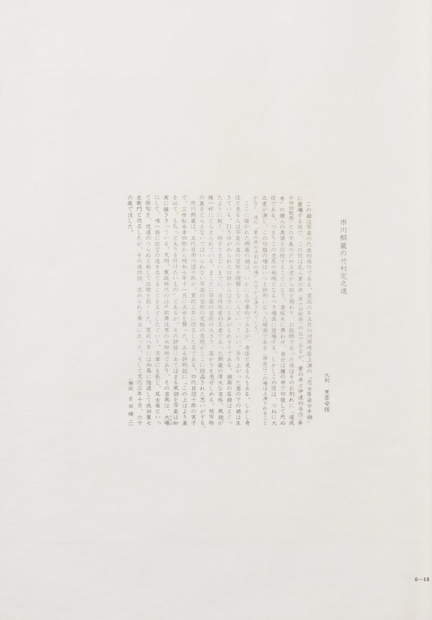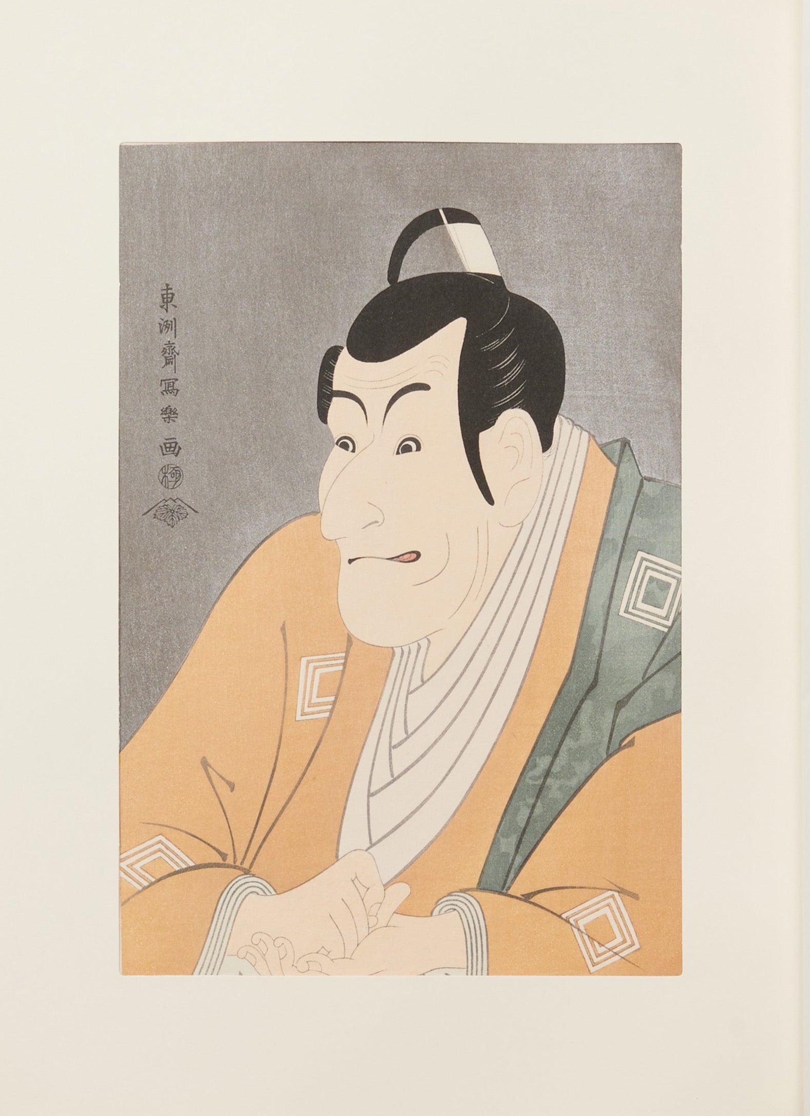 There is a comment in one review saying, 'He would be perfect if he gained a little weight,' and Sharaku faithfully portrays the appearance that matches this comment. "He was a leading figure in the Edo kabuki world during the Tenmei and Kansei eras, and his style focused mainly on the art of kabuki. He was also skilled in writing, excelling in haiku under the name 'Hankoan' and composing kyōka poems under the name 'Hanamichi no Tsuranē.' In the eighth year of Kansei, he retired to Mukōjima and changed his name to Naritaya Shichiemon, but he returned to the stage four times upon request. He passed away at the age of sixty-six in October of the third year of Bunka.