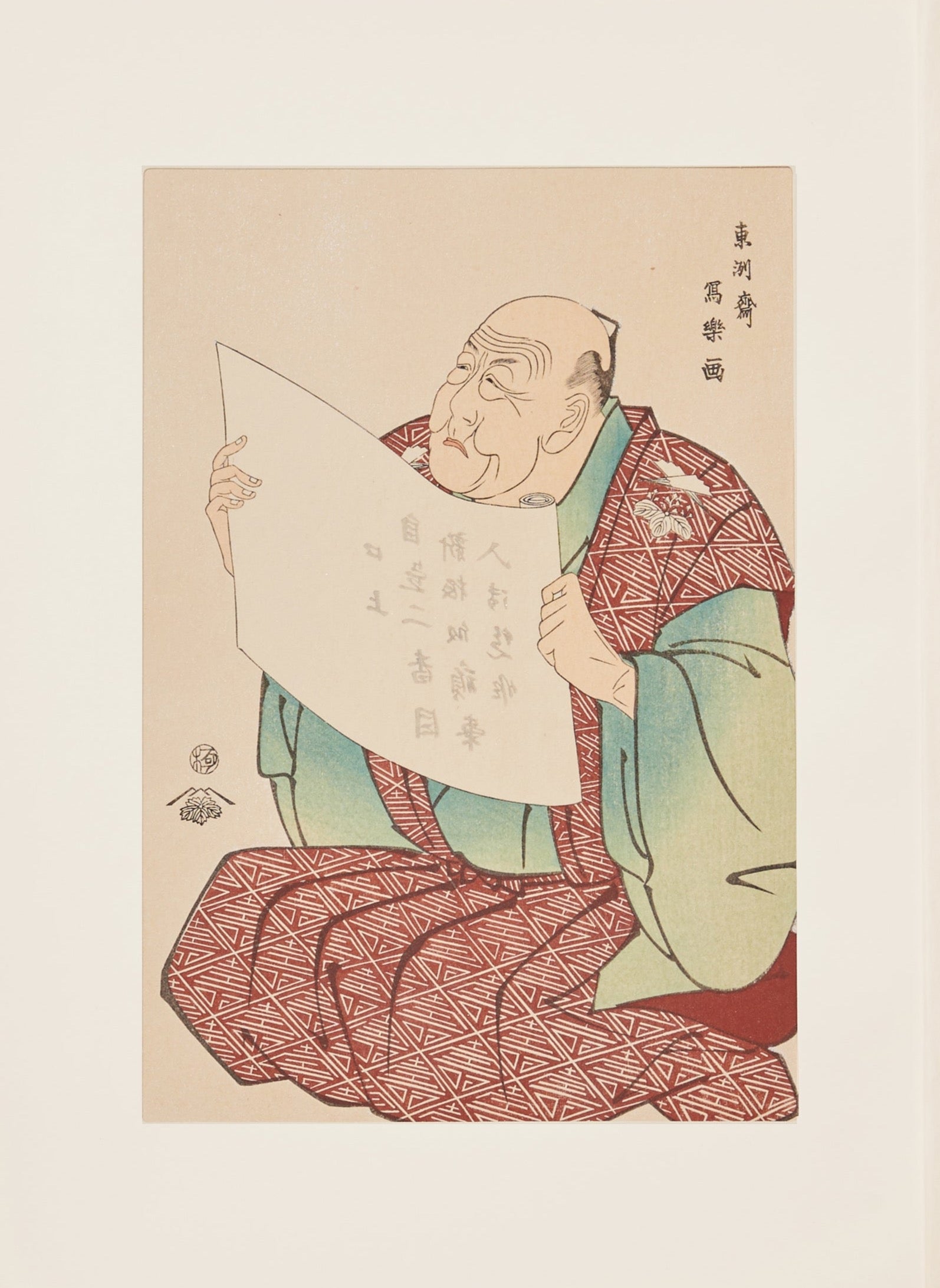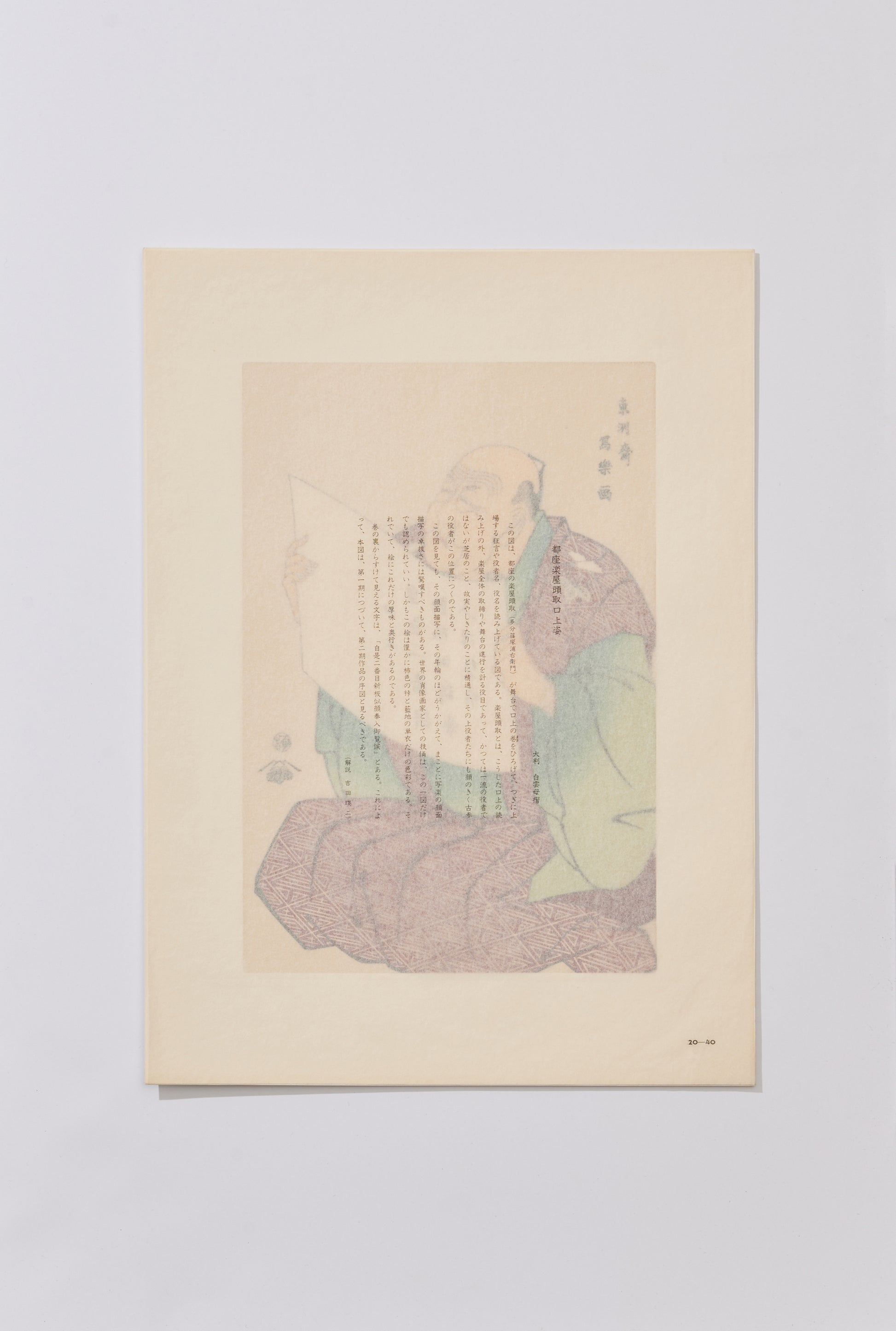 The head announcer not only delivers announcements but also oversees the entire backstage and ensures the smooth progress of the performances. While not necessarily a top actor, the head announcer is typically a seasoned performer who is well-versed in the intricacies of theater traditions and customs, and commands respect among the actors. "Even in this picture, the facial expression reveals the depth of experience, showcasing the remarkable skill of Sharaku in portraying facial features. His prowess as a portrait artist is evident in this single artwork. Moreover, the picture utilizes only subtle colors like persimmon-colored kimono and indigo undergarments, yet it exudes richness and depth.