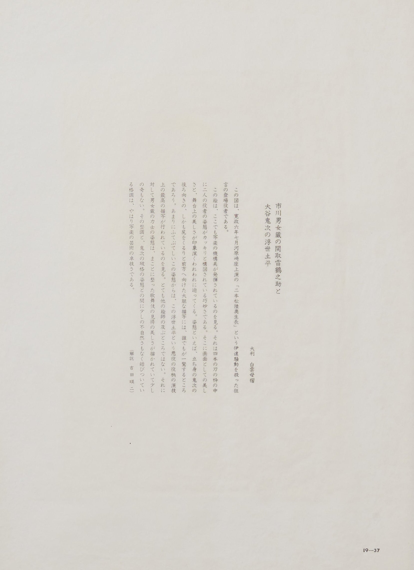 Speaking of postures, one cannot help but be astonished by the bold depiction of Ōtani Oniji's character, Ukiyo Tsuchibei, with his back turned yet his buttocks boldly facing forward. From this audacious posture, one can discern the pinnacle of performance in portraying the villainous role of Ukiyo Tsuchibei. It is truly unmatched by any other artist.
