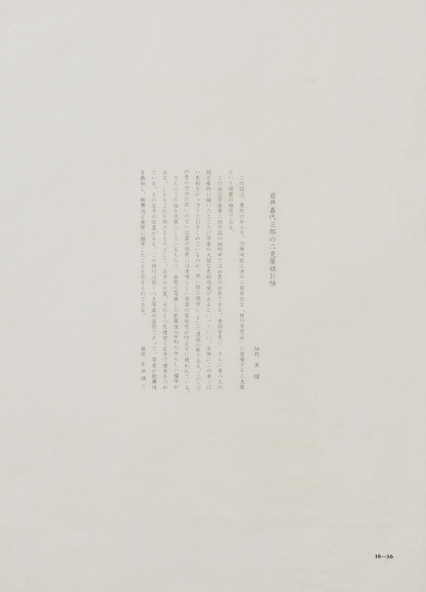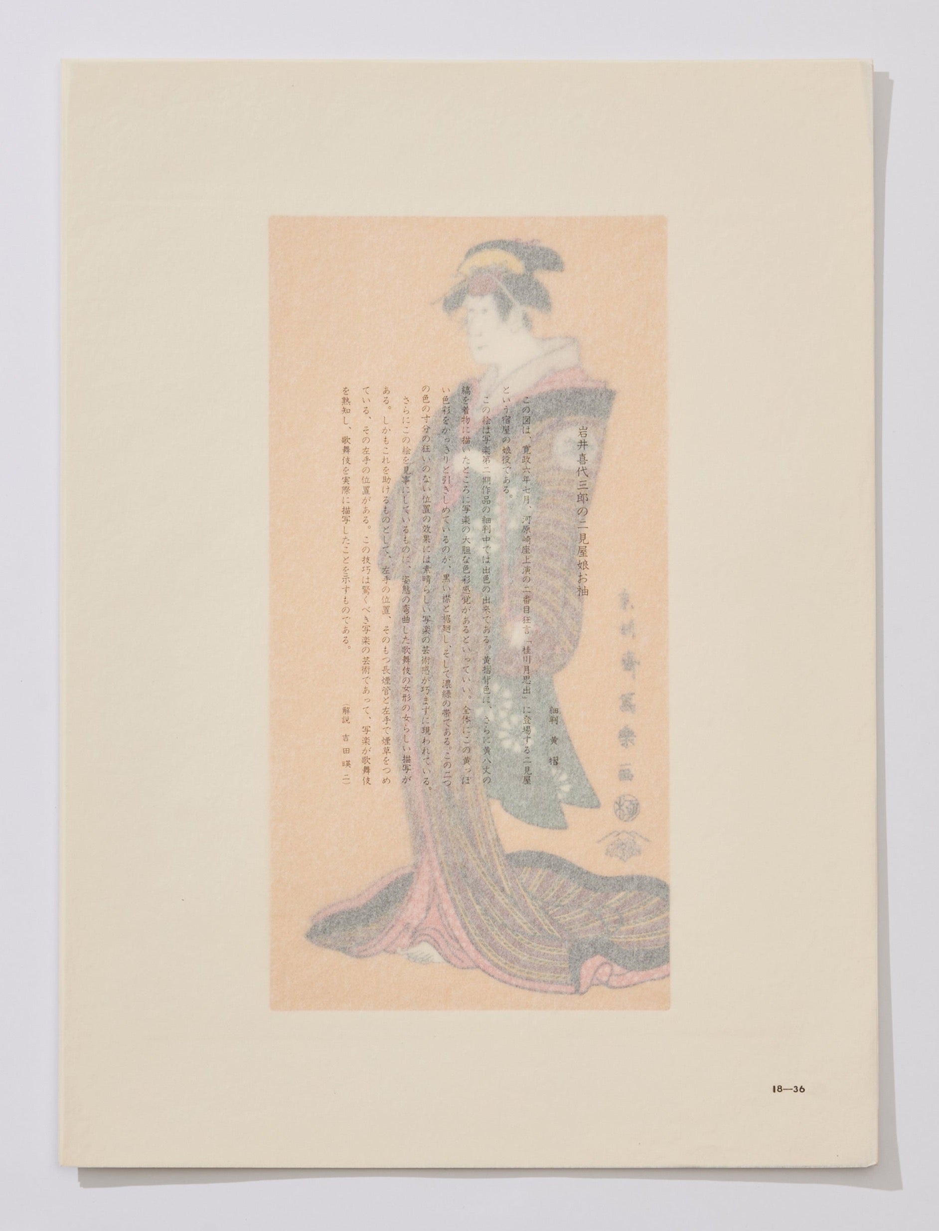 Among Sharaku's works from the second period, this piece stands out as exceptional. The bold use of yellow in the background and the stripes of the kimono, further enhanced by the contrasting black collar and hemline, as well as the deep green obi, showcase Sharaku's daring sense of color. The precise positioning of these two colors creates a remarkable artistic effect, demonstrating Sharaku's mastery of artistic sensibility. What further enhances this picture is the portrayal of the gracefully curved posture characteristic of kabuki onnagata (female role) figures. Moreover, the positioning of the left hand, holding a long smoking pipe and packing tobacco with the other hand, adds to the depiction. This technique is a testament to Sharaku's remarkable artistic skill, indicating his profound understanding and portrayal of kabuki.