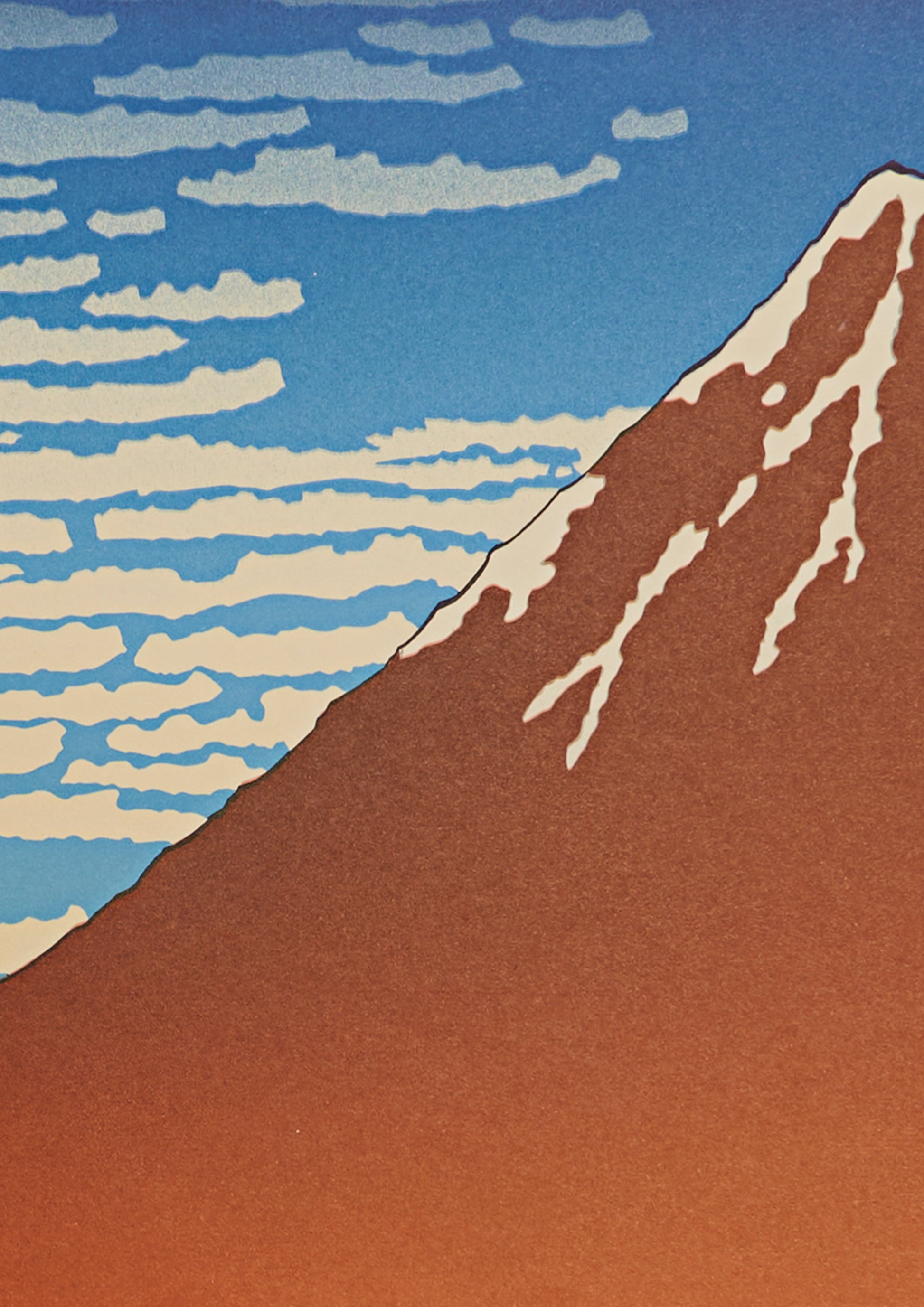Using the technique of gradient printing with indigo, the summit of Mount Fuji is dyed as if burning red against a blue sky, with snow remaining on the peak, giving it a sense of three-dimensionality. It is commonly known as "Red Fuji."