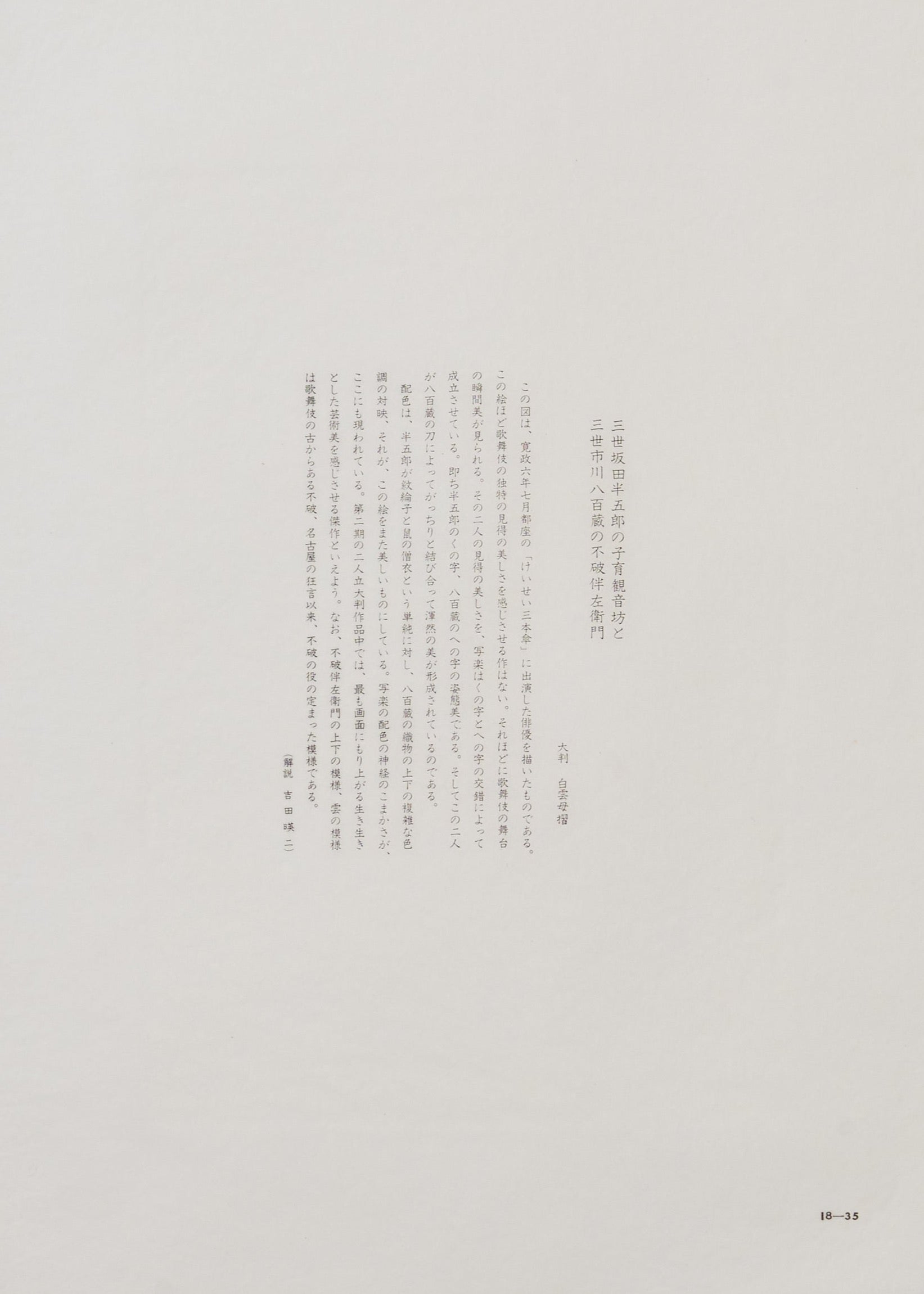 The color scheme contrasts Hangorō's simple monochrome with Yaozō's complex colors, enhancing the beauty of the picture. Sharaku's meticulous attention to color is evident here. Among the large-format two-person works of the second period, this piece stands out as a masterpiece that vividly embodies artistic beauty.