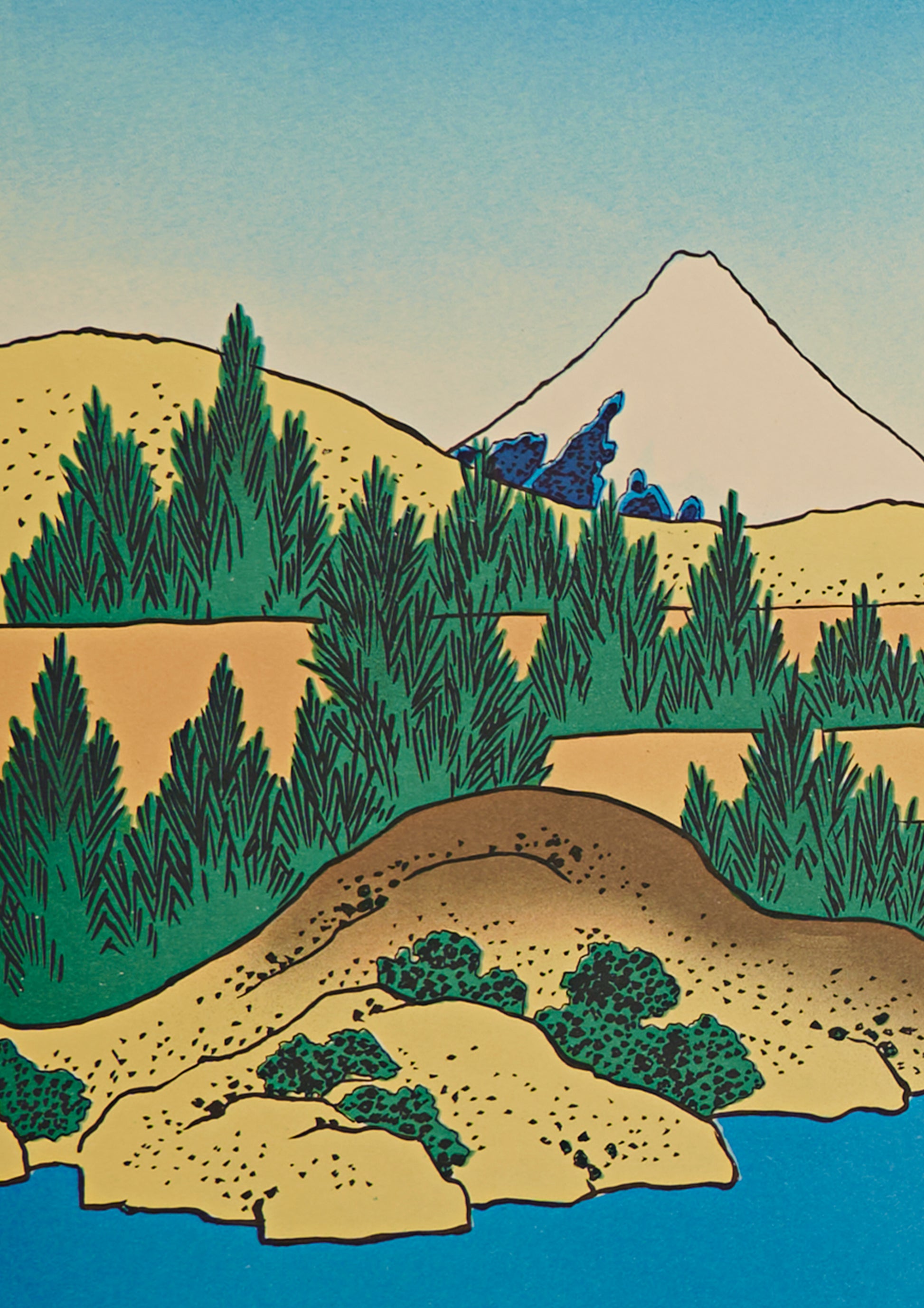 Unlike Hokusai’s more dynamic compositions—filled with movement, figures, and architectural rhythm—this image deliberately eliminates all sources of tension: no people, no boats, no wind, and no waves. The vertical rhythm of cedar trees and the horizontal lines of clouds create a formal equilibrium, evoking stillness and spiritual order. Even scale is flattened; the mountain, the lake, and the land coexist on nearly equal terms, erasing any hierarchy of subject.