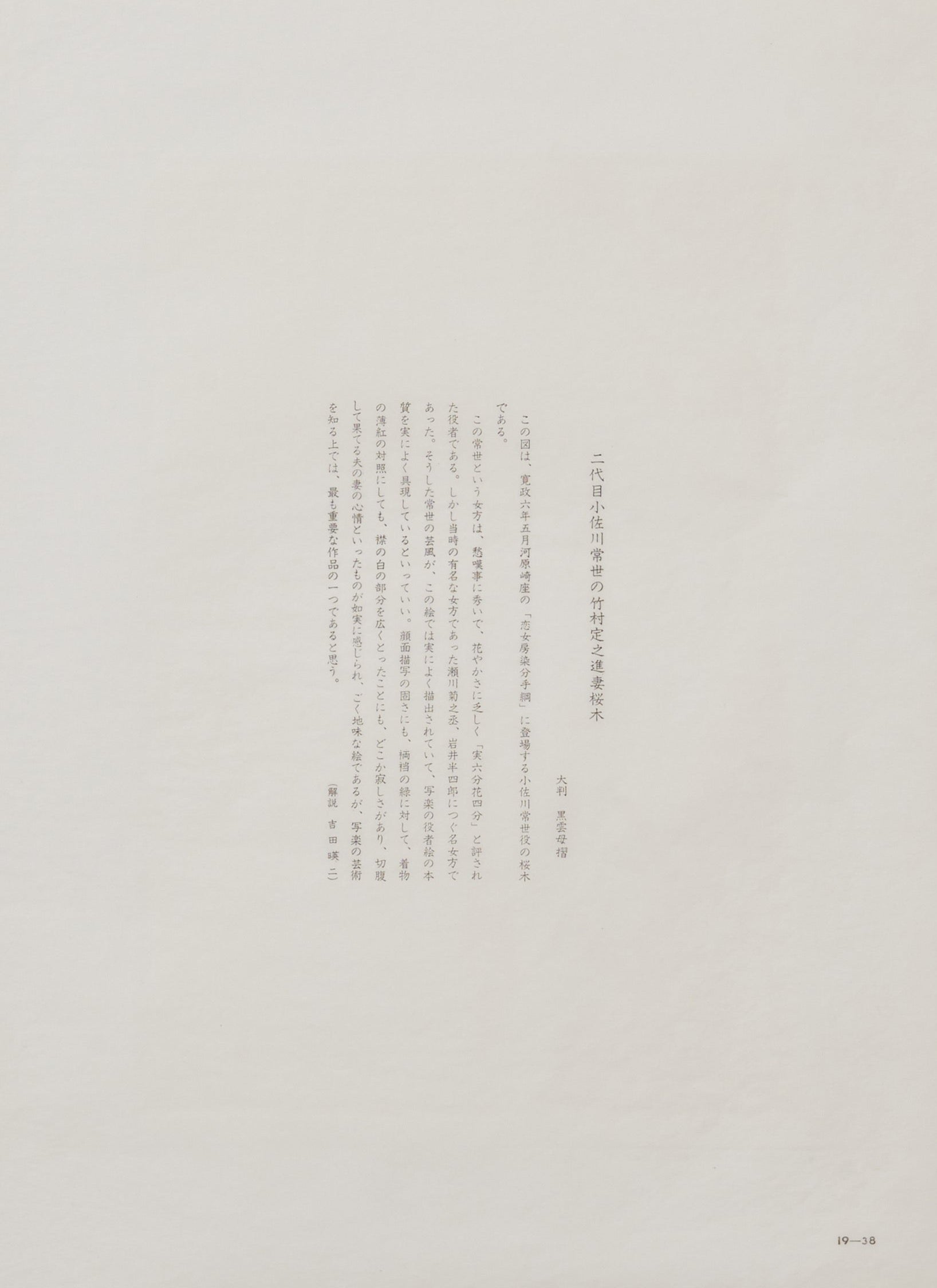 In this artwork, Sakuragi's portrayal effectively captures the essence of Tsuneyo's performance style, embodying the essence of Sharaku's actor portraits. The stiffness in facial expression, the contrast between the subdued green and the light crimson of the kimono, and the prominent white collar all convey a sense of melancholy, vividly reflecting the emotions of a wife who is left behind after her husband's seppuku. Although seemingly modest, this piece is considered one of the most important works for understanding Sharaku's artistry.