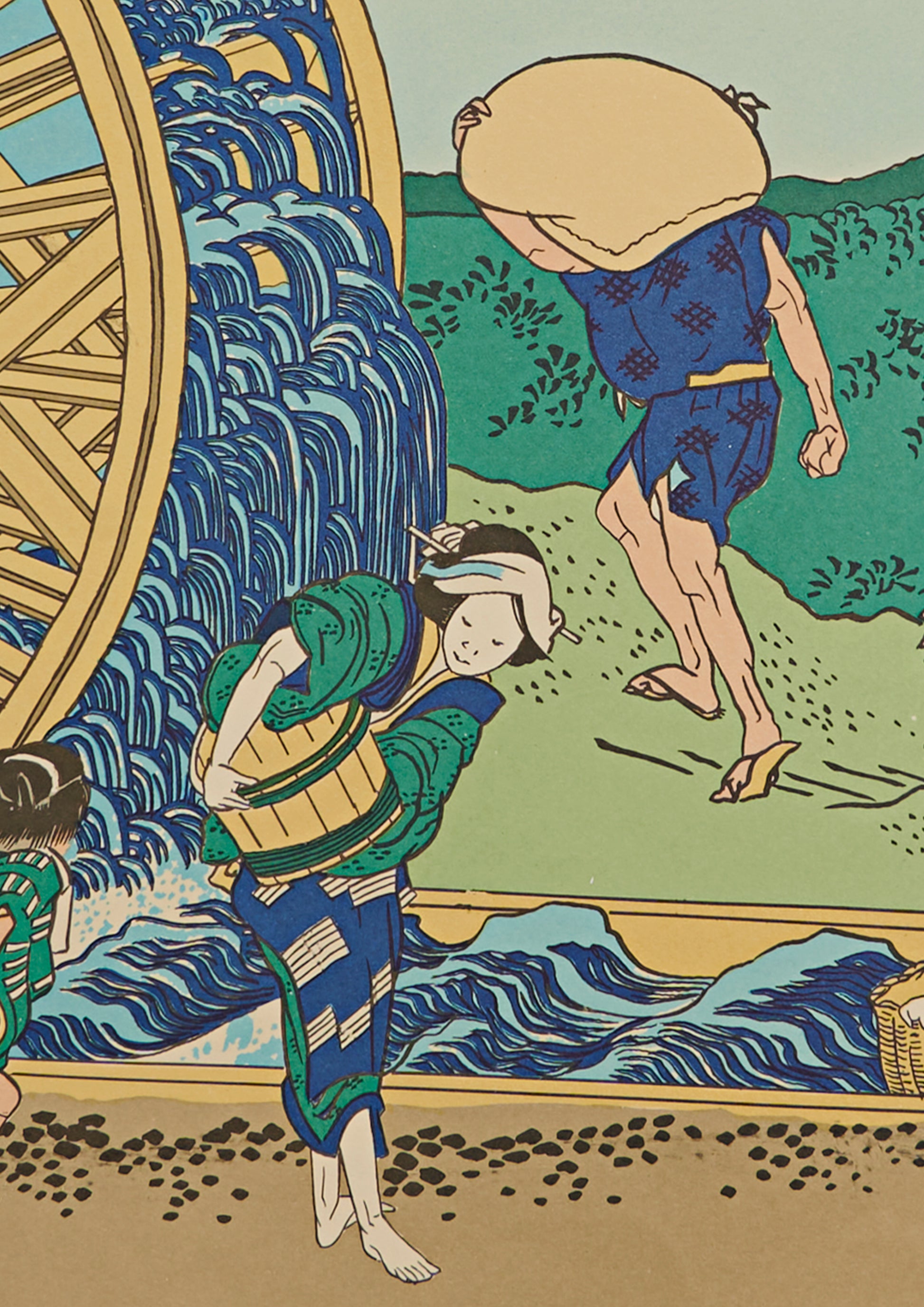 Hokusai’s depiction of water is dynamic and expressive, with the cascading flow from the wheel rendered through rhythmic curves that echo his signature wave patterns. Interestingly, the waterwheel’s perspective is intentionally reversed: the rim becomes larger as it recedes into the distance, an example of Hokusai’s deliberate use of “reverse perspective” to command visual tension and guide the viewer’s gaze between the workers and Mount Fuji.