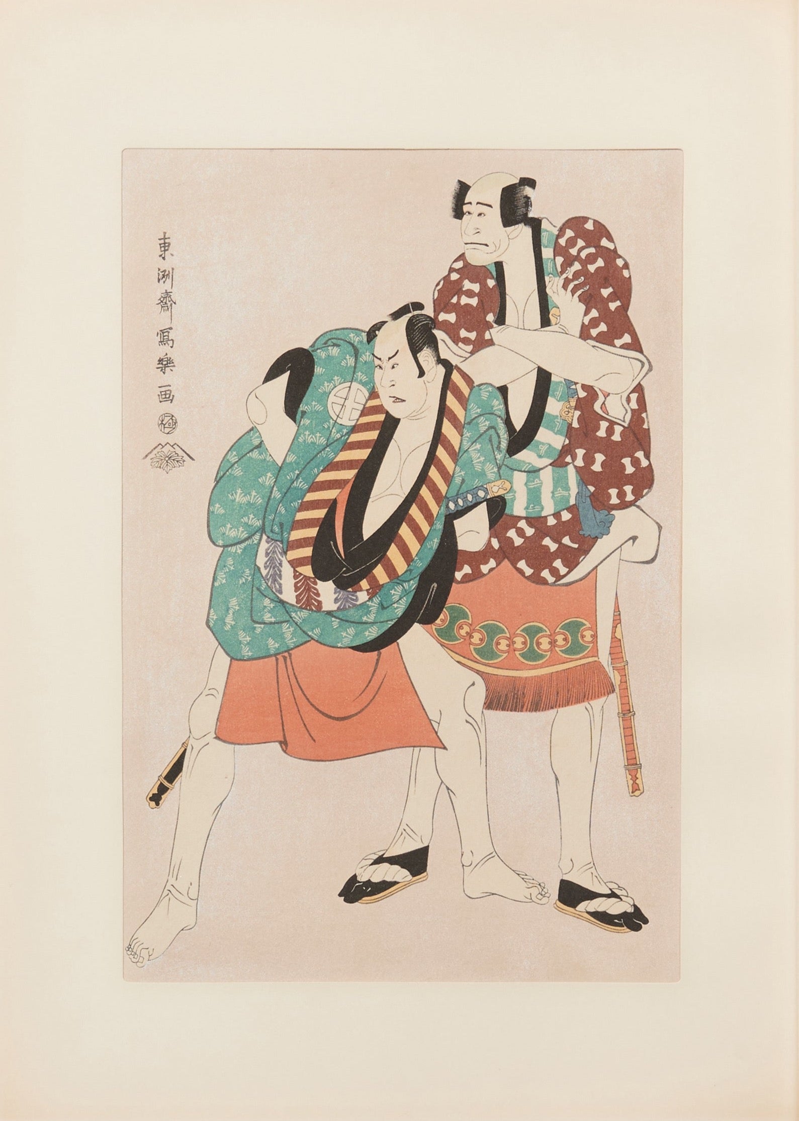 This painting depicts the characters Yakko Ukiyo Matabei, portrayed by Ryuzo Arashi, and Yakko Tosa no Matabei, portrayed by Otani Hiroji III, from the kabuki play "Keisei Sanbon-gasa," which was performed at the Miyako-za Theater in July of the sixth year of the Kansei era (1794). In this play, the characters are retainers of different masters, with Yakko Matabei serving the virtuous character Nagoya-Sanza, and Yakko Tosa no Matabei serving the villainous character Fuwa Hansaemon. The contrast between good and evil is effectively conveyed through the portrayal of these two characters. This contrast is evident in various aspects, including their facial features, body proportions, arm positions, and the colors and styles of their clothing. Sharaku's skillful composition is showcased through the use of a full-length format, which allows the audience to view the actors from a unique perspective, looking up at them from below. As previously noted, Sharaku employs complex geometric arrangements, forming large and small triangles within the composition, creating a visually dynamic and stable structure. This painting is a prime example of his mastery in this regard and is considered one of his masterpieces from the second period of his career.