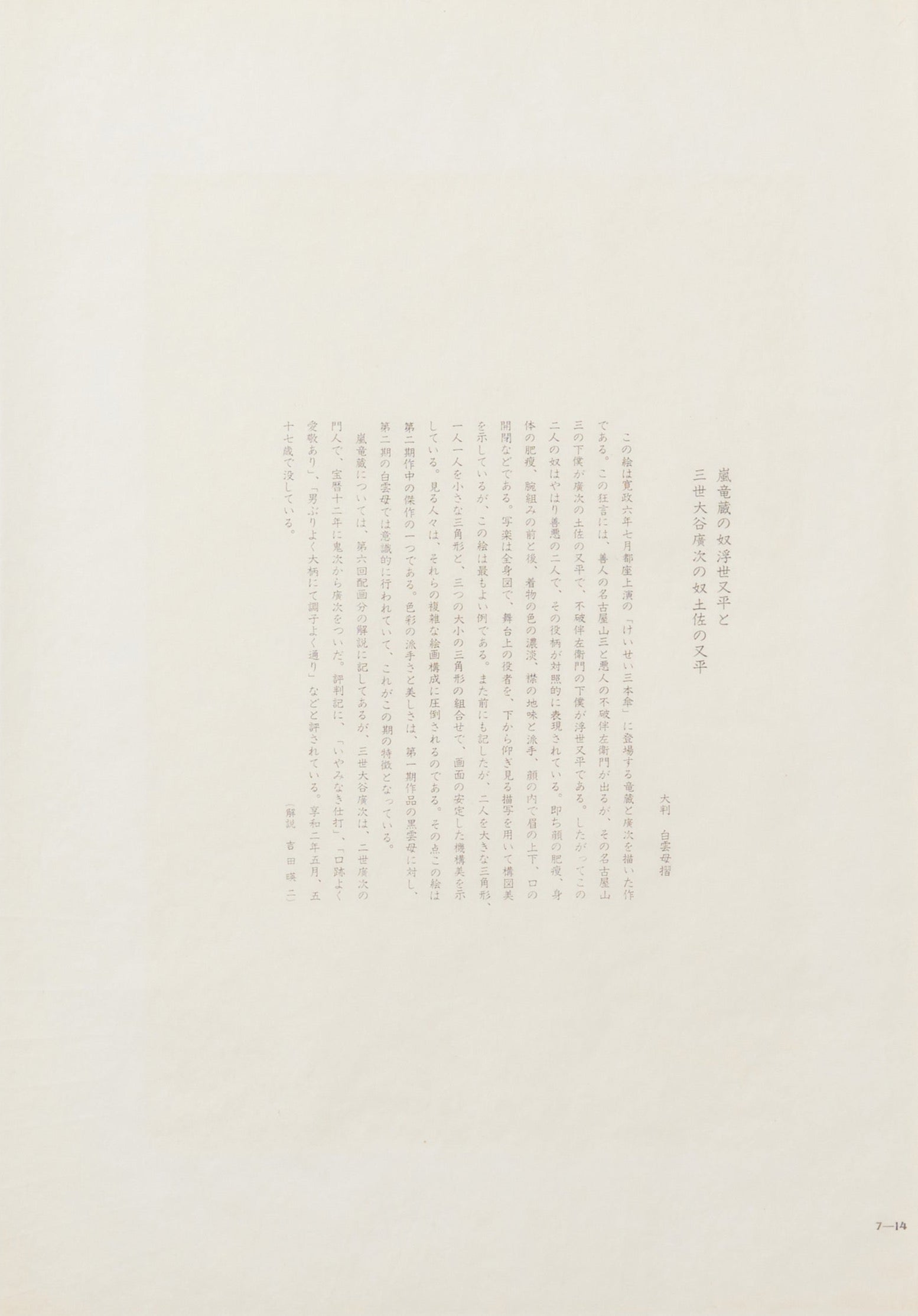 Ryuzo Arashi, as mentioned in the sixth distribution explanation, was known for his distinctive style, and Otani Hiroji III, a disciple of the second Hiroji, was praised for his charismatic performances and commanding presence on stage. He passed away at the age of fifty-seven in May of the second year of the Kyowa era (1802).