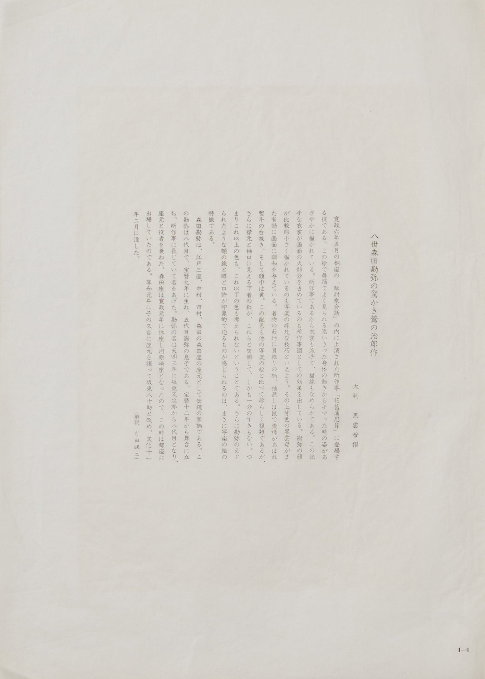 As this is a dance performance, the costume is elaborate, and the lines are smooth. The flashy attire, dominating most of the canvas, enhances the effect of the dance scene. The relatively small depiction of Kan'ya's face demonstrates Sharaku's remarkable skill. Additionally, the background of black mica harmonizes effectively with the composition. The kimono features an indigo base with a clamshell pattern, while the lining displays a chaotic pattern in gray, and the white highlights of the nōshi knots contrast with it. The hood is yellow. This color scheme, although more complex compared to other Sharaku pictures, is carefully balanced, with the strings of the undergarment at the neckline and cuffs intersecting seamlessly, leaving no room for additional colors. Furthermore, the impression of Kan'ya's sculpted cheeks, eyes, and mouth is striking and conveys the characteristic intensity found in Sharaku's pictures.