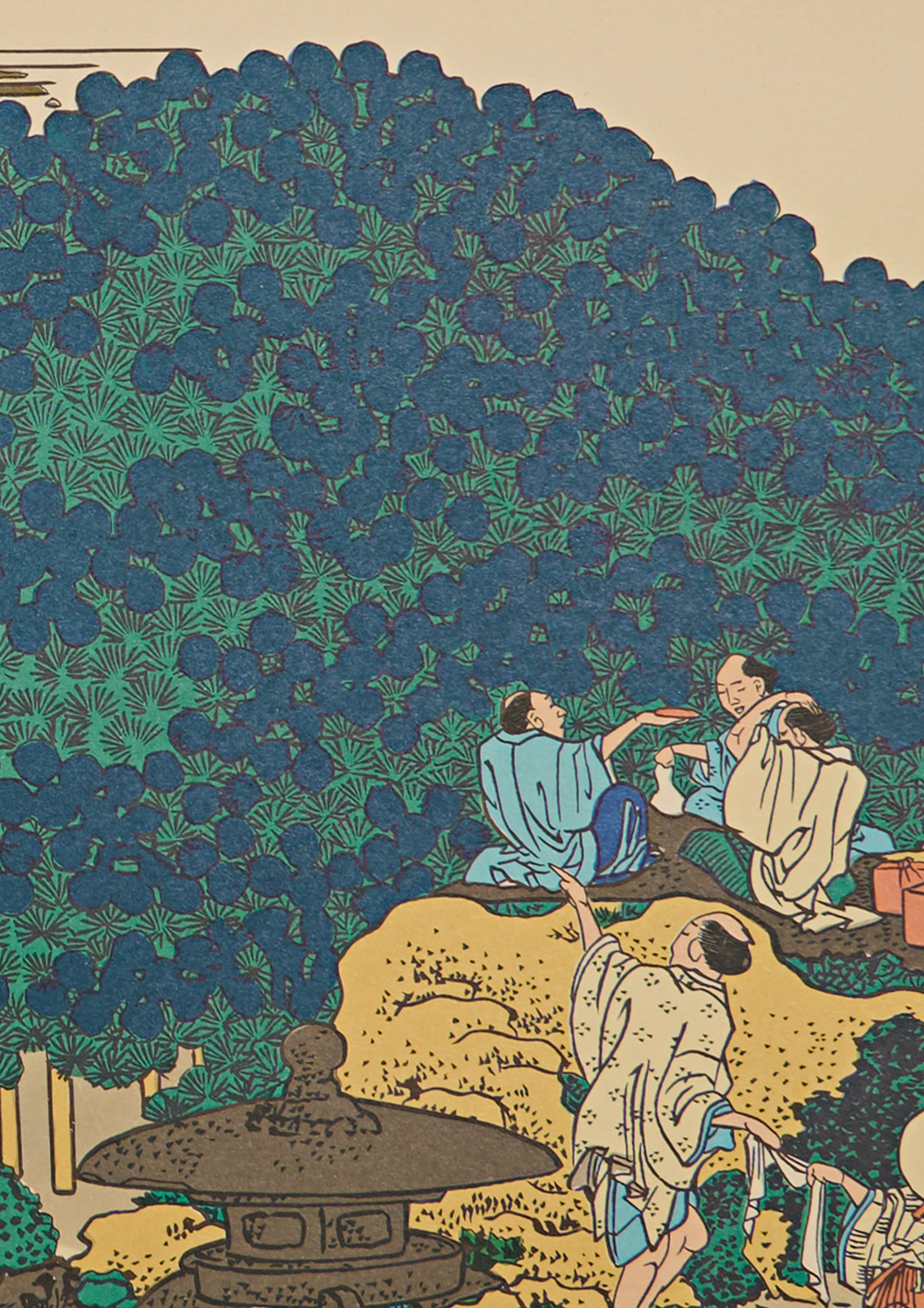 Hokusai depicts the massive pine grove as a great green dome, its round contour echoing a hill. Beneath its shade, visitors gather for a lively banquet; a father helps his child climb the slope, while others tidy fallen needles or share sake. The details capture the warmth of human presence, yet the composition remains highly stylized.